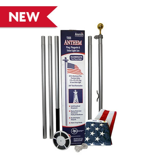 Decorate the landscape of your home or residence with this 20′ Flagpole, 3’x5′ Nylon US flag and Solar powered flagpole light. Our 20′ Anthem with flag and light set are suited for low wind areas and not recommended for coastal or gusty wind locations. These sets showcase an illuminated US Flag and add a decorative touch to any lawn or grass space. The Solar Powered Discs collect light by day and shine onto the flag at night. These Flag Sets are easy to install and are sure to enhance the beauty of any yard, neighborhood, office park or church.