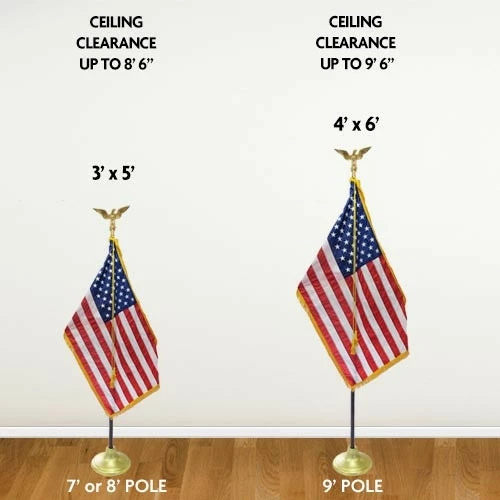 When placing your indoor U.S. flag set, please allow at least 6” of ceiling clearance. To extend the telescopic pole to its full height, you will need a ceiling clearance of at least 9’6” to fit the eagle ornament. A standard room size, such as a home or office, has a ceiling of around 8’. For those rooms, we recommend setting your telescopic pole to 7’.