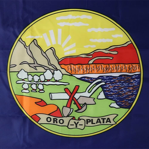 Montana’s official flag was adopted on July 1, 1905, and features a dark blue field with the state seal in the center. Depicted within the great seal is a landscape representing the Rocky Mountains, a central feature of the state. The scene shows mountains, rivers, and the great falls of the Missouri River. The seal also depicts a crossed pick and shovel to symbolize the state’s rich agricultural and mining industries. The state motto, “Oro y Plata”(Spanish for gold and silver), is inscribed below.