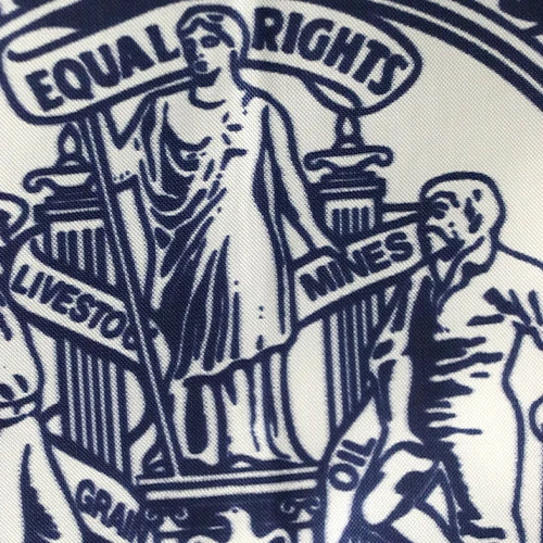 While the blue signifies justice and virtue, the red pays homage to Wyoming’s Native American heritage and the blood spilled in battle. White represents purity and uprightness. Within the state seal, the Greek Goddess Nike holds a banner reading “equal rights.” Wyoming holds a special status in the suffragist movement because it was the first state that gave women the right to vote.