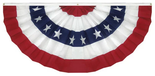 Our Patriotic fan with stars is the perfect decorative touch to infuse into your décor. This poly cotton fan feature red, white and blue stripes. White five-pointed stars highlight the blue stripe creating the stars and stripes in a decorative style. The patriotic fan features a tough, durable header and an impeccably stitched hem to prevent fraying. Showcase your patriotism with this beautiful fan. Brass grommets allow easy attachment to poles, houses, porches, stages or floats. The Patriotic fan has a hemmed edge to prevent fraying, and it allows for repeated use. The Patriotic fan with stars is made with the highest quality poly-cotton materials and has bright colors that will not fade due to exposure to the sun or due to time. Carrot Top is committed to providing professional customer service and superior quality. We offer a wide range of decorative products and goods to meet your decorative and patriotic needs. Choose an American flag or a state flag to complete your look. Mini American and state flags are also available. Carrot Top also features Internment flags. Quantity discounts are available.